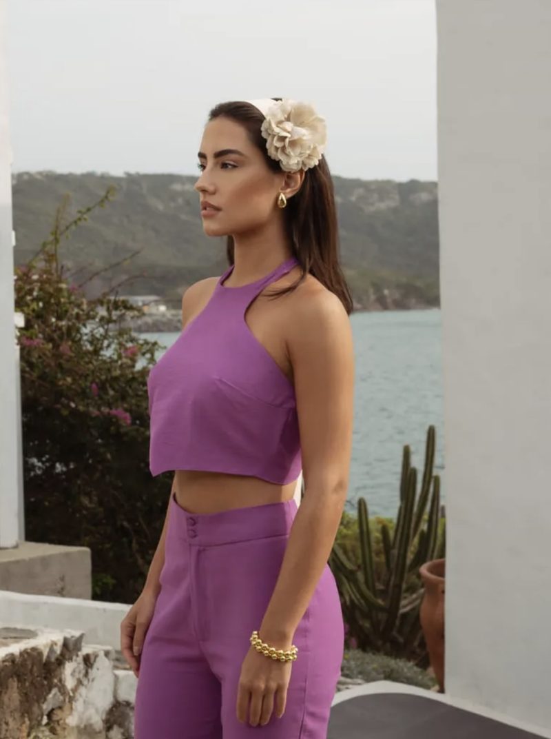 Detalhes: Cropped com amarração nas costas e calça com zíper e botões