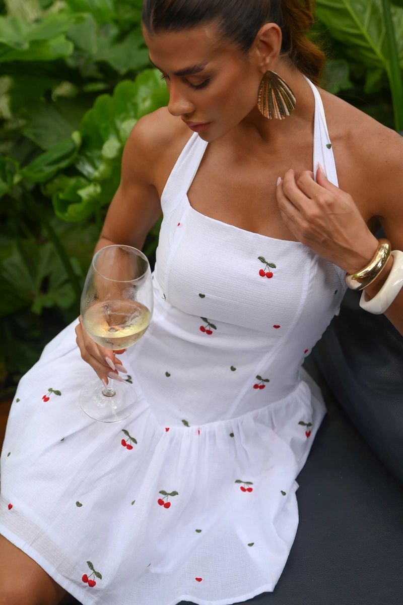 O design delicado traz detalhes sutis e acabamento refinado, tornando a peça versátil e atemporal. O decote halter confere um toque moderno e sofisticado, enquanto o comprimento curto equilibra charme e praticidade, perfeito para produções diurnas e ocasiões ao ar livre.